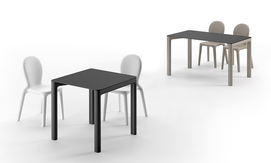 / 2019 design BereniceSet of tables composed of a supporting PE leg structure, rotomoulded polyethylene, combined with black HPL tops, suitable for both indoor and outdoor use. The modern and minimal lines make them particularly versatile in furnishing contemporary contexts.