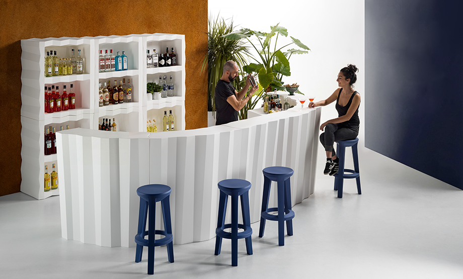 Combinado con el elemento lineal, cumple la función de unión para crear barras de bar o escritorios de recepción. Predispuesto para alojar un juego de luces estándar o con luz RGB, usado en pareja, puede crear áreas de recepción envolventes e iluminadas.