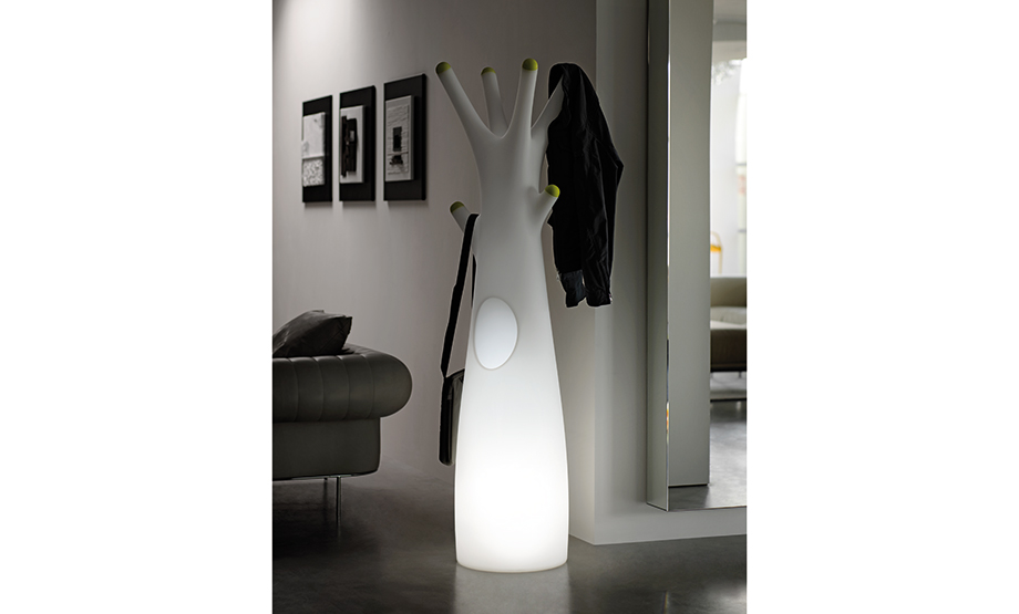Completo con un apoyo portaobjetos y apéndices intercambiables de distintos colores para adaptarlo tanto a un espacio privado como a un contexto público como salas de espera o vestíbulos de hoteles. En versión luminosa contribuye a crear una atmósfera encantada en el entorno donde se coloca.
