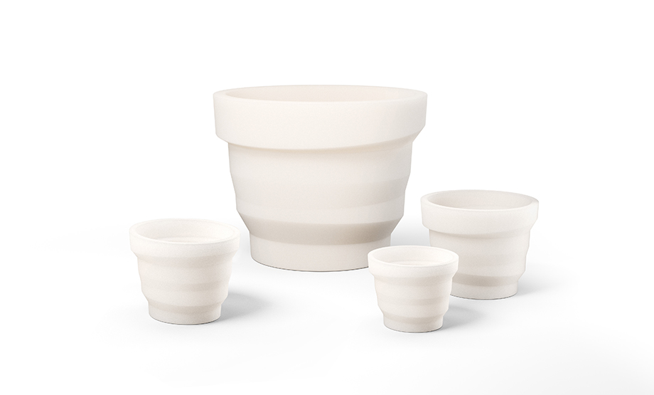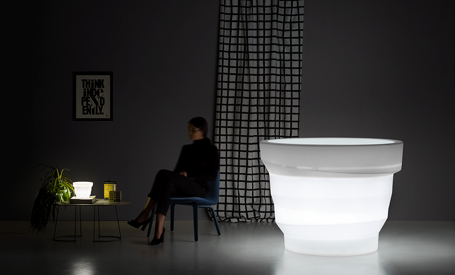 En el dialecto de Milán, “rebelot” significa “caos” y la forma de este objeto se caracteriza precisamente por el aparente y caótico cambio de planos. Los cinco formatos diferentes hacen de este macetero el artículo ideal para plantas o decoraciones vegetales de distintos tamaños y en la versión maxi es las más apropiada para decorar los vestíbulos de uso colectivo o los espacios abiertos. En versión luminosa los planos interrumpidos contribuyen a crear fuertes contrastes de luces y sombras, para transmitir una luz que crea un clima enérgico y participativo.