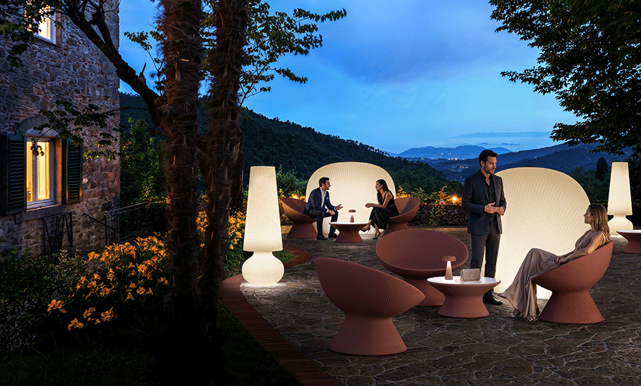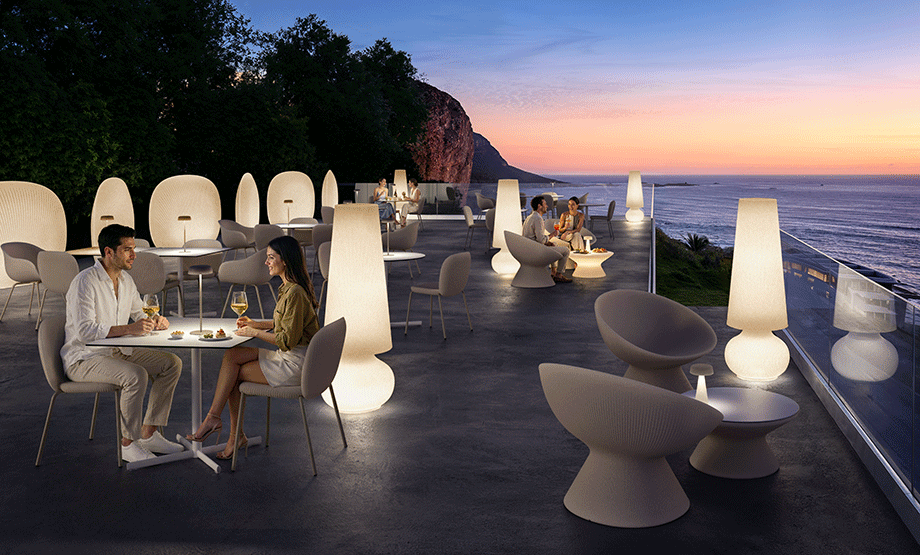 La sua linea è morbida, singolare la superficie rigata e particolari le finiture che ricordano materiali naturali. Nella versione white light il tavolino può essere illuminato dotandolo di apposito kit di illuminazione.